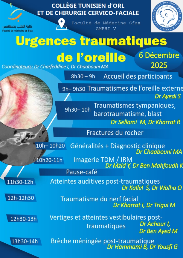 | Urgences traumatiques de l’oreille | 06/12/2025 | FM Sfax | Dr. I. Charfeddine Dr. MA. Chaabouni |
